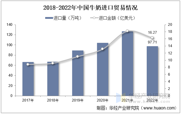 我国牛奶次要以进口为从,进口规模弘远于出口规模。跟着近年来我国牛奶消费需求的快速上涨,我国牛奶进口规模也随之不竭扩张。据材料显示,2022年我国牛奶进口量为97。71万吨,同比下降23%;进口金额为16。27亿美元,同比下降10。3%。