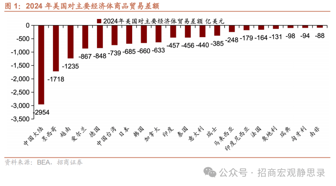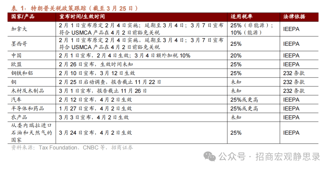 4月初为关税风险集中期。4月1日美国将发布《美国优先商业政策》备忘录审查成果,沉点审查中美第一阶段经贸和谈、拜登任期内301查询拜访复审成果、中国PNTR(永世一般商业关系)地位。同日,还将发布对非美的全数对等关税审查成果,4月2日颁布发表对等关税政策和针对汽车、制药、半导体等特定行业关税。此后或将予以反击。截至3月25日,已落地的关税包罗:1)对不合适USMCA(美墨加协定)的加墨产物额外征收25%关税(此中能源产物关税为10%);2)对中国商品额外纳税20%关税;3)对全球钢铁和铝产物纳税25%关税。4月2日即将实施的关税包罗:1)对等关税,针对特定国度和产物;2)合适USMCA的加墨产物征收25%关税;3)对欧盟征收25%额外关税;4)对汽车、制药、半导体、农产物加征关税;5)对所有从委内瑞拉进口油气的国度征收25%关税。此外,特朗普还启动了对铜、木材及木成品的232查询拜访,估计11月下旬发布查询拜访成果。对等关税方针或为精准冲击、趋利避害。考量一:添加美产物的采办需求。正在实施对等关税后,美国或尽快鞭策取部门国度告竣阶段性和谈,添加对美国商品的进口,添加外企正在美投资。考量二:确保环节产物自从可控。对钢铝、铜、半导体、制药等产物宽免的可能性较低,且后续将提高对环节矿物、尖端制制产物的税率。考量三:减弱以中国为代表的非美制制大国的合作力。好比,虽然中美可能磋商构和,但最终税率总体仍是向特朗普竞选许诺挨近以至跨越。此外,美亦有可能借帮关税手段令其盟友通过“分歧对华加征关税换取本身关税宽免”。对等关税若何实现“精准冲击”?1)商业差额维度下,关心中国、墨西哥、越南、、、中国、日本、韩国、;2)双边关税差额维度下,关心印度、阿根廷、韩国、巴西、泰国;3)差额维度下,关心欧盟、阿根廷、土耳其、俄罗斯、英国、法国、、印度、墨西哥。除了已实施的墨西哥、、中国外,特朗普近期还明白暗示对欧盟和印度实施对等关税,分析考虑以上三个维度,越南、泰国、韩国、日本可能也正在4月2日的名单之中。关税素质是负和博弈。为评估关税对出口、产出、通缩等目标的分析影响,我们拔取静态的全球商业阐发模子(GTAP模子)进行建模。情景一:对中国加征20%额外关税,对墨西哥、、欧盟各加征25%额外关税,对其他地域加征平均10%额外关税,对钢铁和铝加征25%额外关税。现实P方面,3-5年维度下美国现实P累计总额较基线%,中国、欧盟、、墨西哥、其他地域3-5年维度下现实P累计总额别离较基线年维度下全球现实P累计总额较基线%,可见关税素质是负和博弈。出口金额方面,3-5年维度下美国出口累计总额较基线年维度下中国、欧盟、、墨西哥、其他地域出口累计总额别离较基线年维度下全球出口累计总额较基线%。进口金额方面,3-5年维度下美国进口累计总额较基线年维度下中国、欧盟、墨西哥、其他地域进口累计总额别离较基线年维度下全球进口累计总额较基线%。通缩方面,3-5年维度下美国CPI指数较基线年维度下中国、欧盟、、墨西哥、其他地域CPI指数别离较基线%。情景二:较当前已推进景象进一步加码,例如,对中国加征40%额外关税,对墨西哥、、欧盟各加征25%额外关税,对其他地域加征平均10%额外关税,对钢铁和铝、汽车、半导体和药品加征25%额外关税。现实P方面,3-5年维度下美国现实P累计总额较基线年维度下中国、欧盟、、墨西哥、其他地域现实P累计总额别离较基线年维度下全球现实P累计总额较基线%。出口金额方面,3-5年维度下美国出口累计总额较基线年维度下中国、欧盟、、墨西哥、其他地域出口累计总额别离较基线年维度下全球出口累计总额较基线%。进口金额方面,3-5年维度下美国进口累计总额较基线年维度下中国、欧盟、、墨西哥、其他地域进口累计总额别离较基线年维度下全球进口累计总额较基线%。通缩方面,3-5年维度下美国CPI指数较基线年维度下中国、欧盟、、墨西哥、其他地域CPI指数别离较基线%。分析来看,美国加征关税无论是正在景象一仍是景象二,对美国经济的短期冲击均高于对中国及其他经济体的冲击,做为美国目前最大的(单一经济系统下)商业伙伴,美国加征关税对中国出口的影响较着高于其他经济体。此外,关税短期推高了美国通缩,但对次要商业伙伴反而会发生通缩效应(全球商业萎缩叠加国内供给添加)。4月1日美国将发布《美国优先商业政策》备忘录审查成果,沉点审查中美第一阶段经贸和谈、拜登任期内301查询拜访复审成果、中国PNTR(永世一般商业关系)地位,还将发布对非美的全数对等关税审查成果,4月2日颁布发表对等关税政策和针对汽车、制药、半导体等特定行业关税。此后或将予以反击。好比,3月11日欧盟委员会暗示,“欧盟的反制办法将分两步实施,从4月1日起头,并于4月13日全面实施。”截至3月25日,已落地的关税包罗:1)对不合适USMCA(美墨加协定)的加墨产物额外征收25%关税(此中能源产物关税为10%);2)对中国商品额外纳税20%关税;3)对全球钢铁和铝产物纳税25%关税。4月2日即将实施的关税包罗:1)对等关税,针对特定国度和产物;2)合适USMCA的加墨产物征收25%关税;3)对欧盟征收25%额外关税;4)对汽车、制药、半导体、农产物加征关税;5)对所有从委内瑞拉进口油气的国度征收25%关税。此外,特朗普还启动了对铜、木材及木成品的232查询拜访,估计11月下旬发