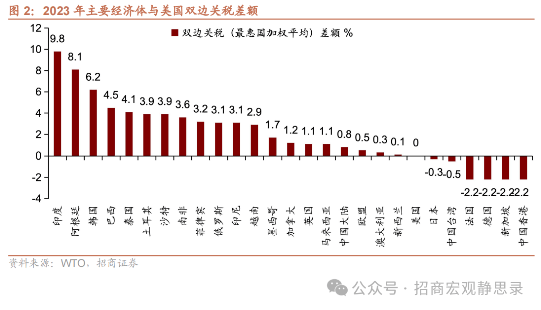 2)双边关税差额维度。从最惠国加权平均关税税率看,美国目前税率为2。2%,大部门经济体高于这一程度,此中取美国差距较大的经济体包罗:印度(9。8%)、阿根廷(8。1%)、韩国(6。2%)、巴西(4。5%)、泰国(4。1%)。